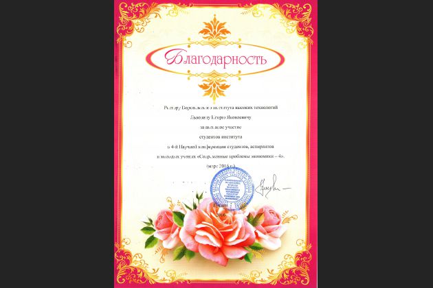 С 10 по 14 марта в г. Ереван (Армения) прошла 4-я научная конференция студентов, аспирантов и молодых ученых «Современные проблемы экономики – 4». Организаторами мероприятия выступили: факультет экономики и менеджмента Ереванского государственного университета, объединение молодых ученых Ереванского государственного университета, студенческое научное общество факультета экономики и менеджмента ЕГУ.