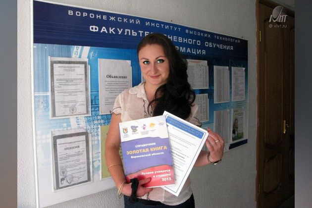 Вышла в свет “Золотая книга Воронежской области: лучшие учащиеся и студенты 2013”, в этом году «золотыми» выпускниками стали более 1500 талантливых учащихся и студентов. Среди них – талантливая молодежь ВИВТ. Мы гордимся Хромых Алвард, Андрусенко Владимиром, Павловой Мариной, Житеневой Викторией. Эти студенты активно участвовали во внеучебной жизни института, представляли свои работы на Всероссийских и Международных конференциях и конкурсах, получали награды и почетные дипломы. Кстати, о самой книге. Этот справочник выходит в рамках проекта "Российские интеллектуальные ресурсы" и программы "Интеллектуальные ресурсы Воронежской области". Поддерживать талантливую молодежь помогают Российский Союз Молодежи, Департамент образования, науки и молодежной политики Воронежской области, Объединение Работодателей "Совет промышленников и предпринимателей Воронежской области", Совет ректоров воронежских вузов. В рамках проекта «Золотая книга Воронежской области: лучшие учащиеся и студенты» не только происходит отбор одаренных выпускниках общеобразовательных, среднеспециальных и высших учебных заведений региона, но и осуществляется содействие им в дальнейшем получении образования и трудоустройстве.